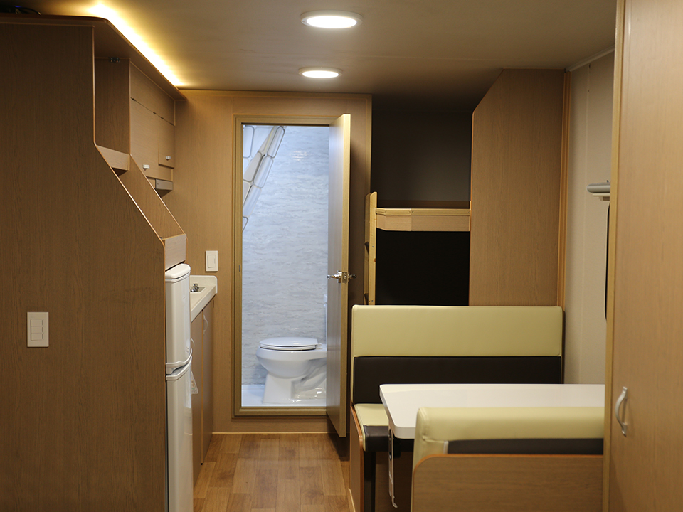 - Interior : Bunk bed (2100*900/insulated floor type), double bed (2100*1400/mattress), convertible table & bed (2100*1000/mattress), multifunctional wardrobe, wide bathroom (shower & toilet), TV shelf, Multi-type kitchen (artificial marble)